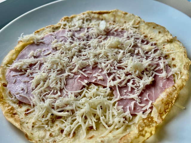 Chez nous, les crêpes salées, c’est simple , du jambon, du fromage, on roule, on passe au four et on se régale.