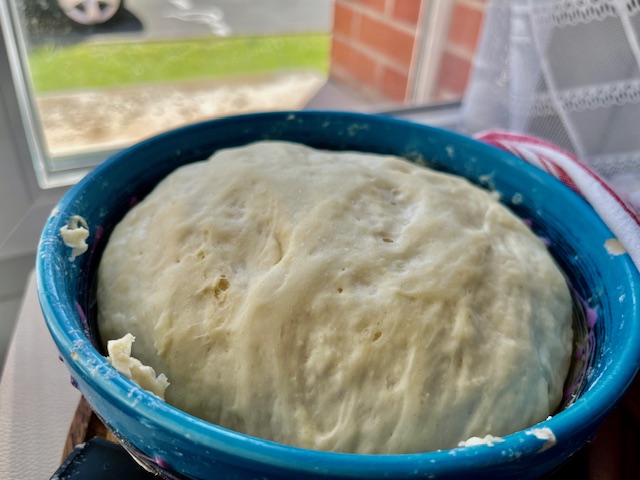 Voici la pâte après repos: elle doit être souple, gonflée et pleine de petites bulles.